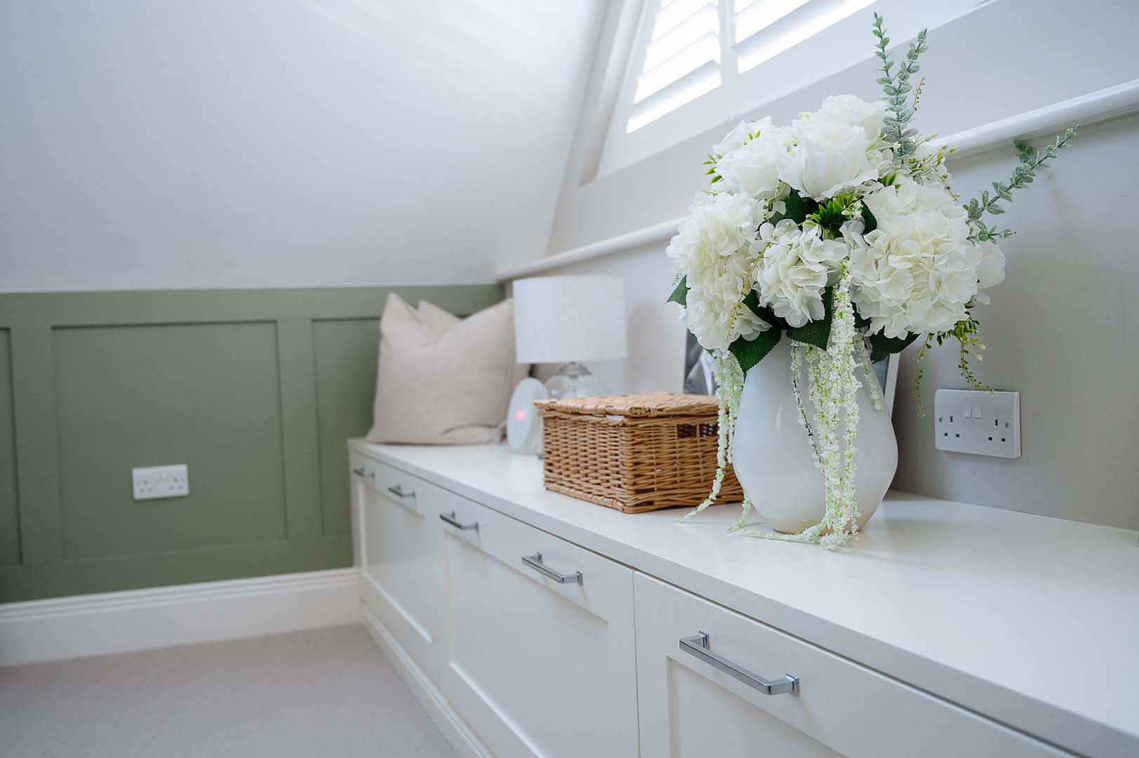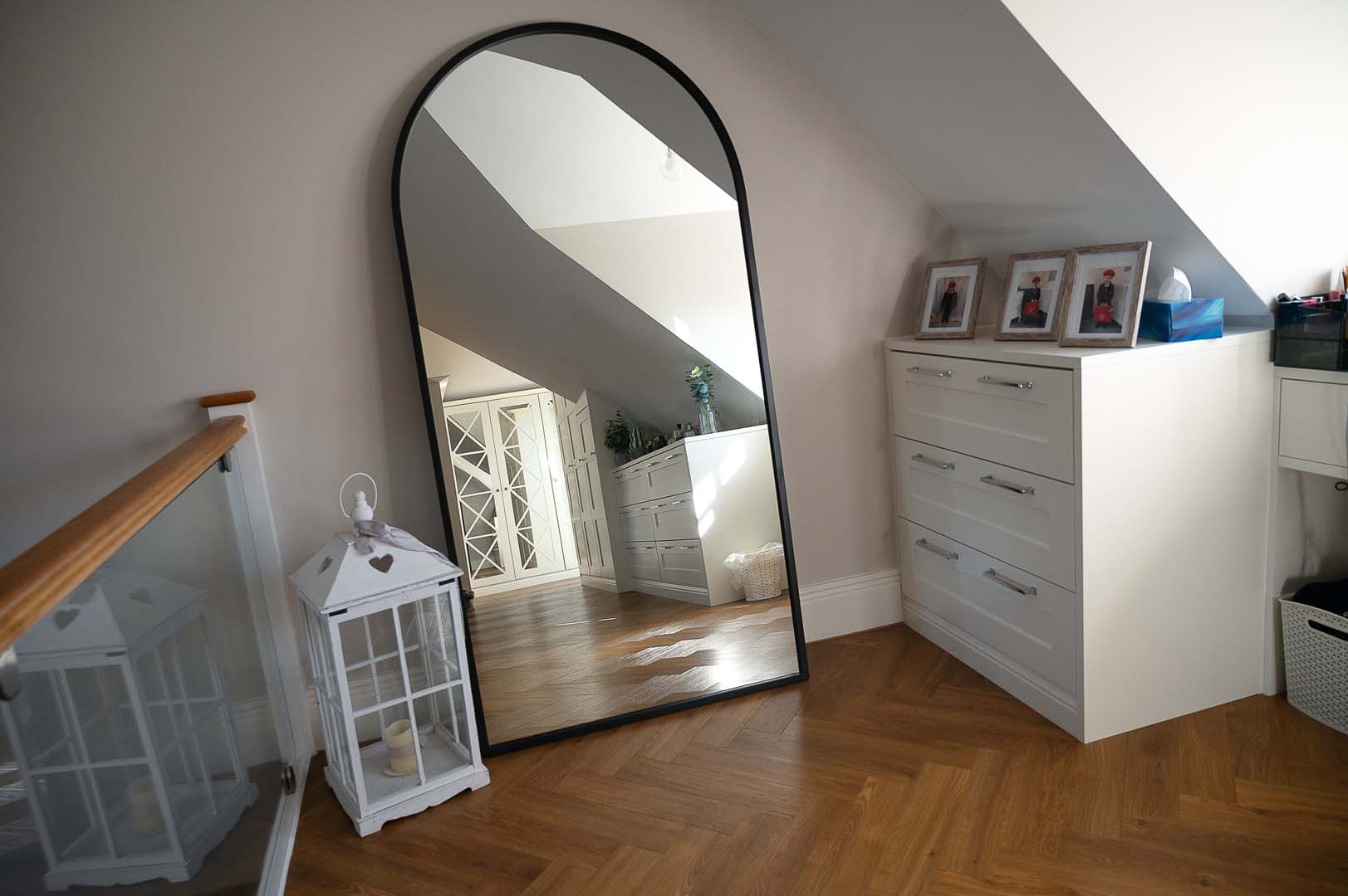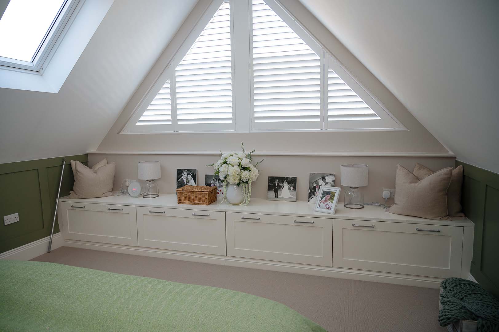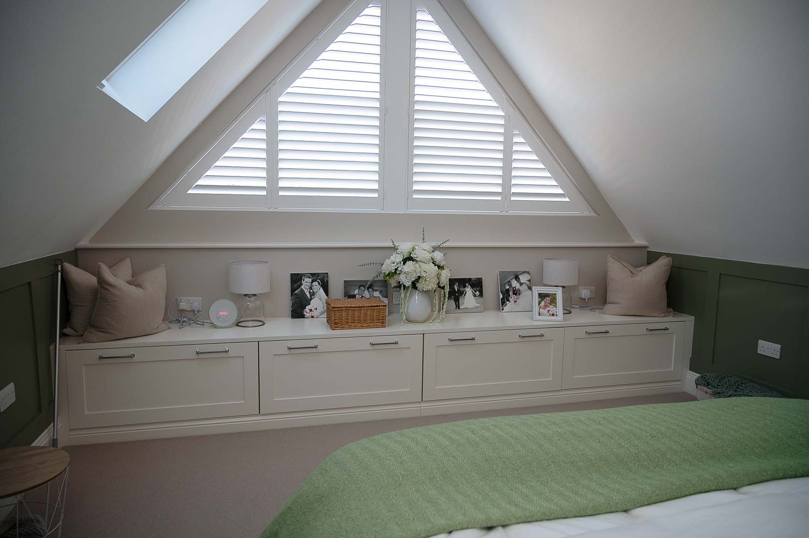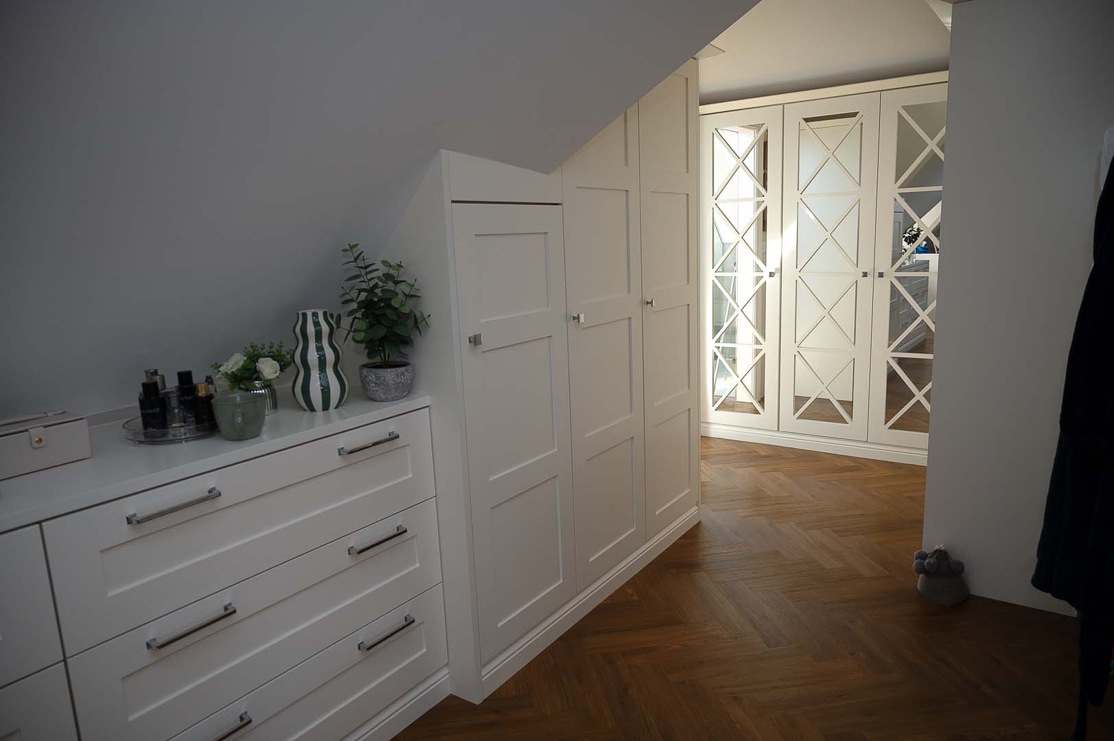 Designed to maximise storage while enhancing the aesthetics of the space, the room features custom built wardrobes tailored to fit the unique angles of the ceiling. The shaker style doors add a classic touch, while the mirrored wardrobes with Fret detailing introduce a sense of luxury and depth, reflecting natural light to brighten the space.