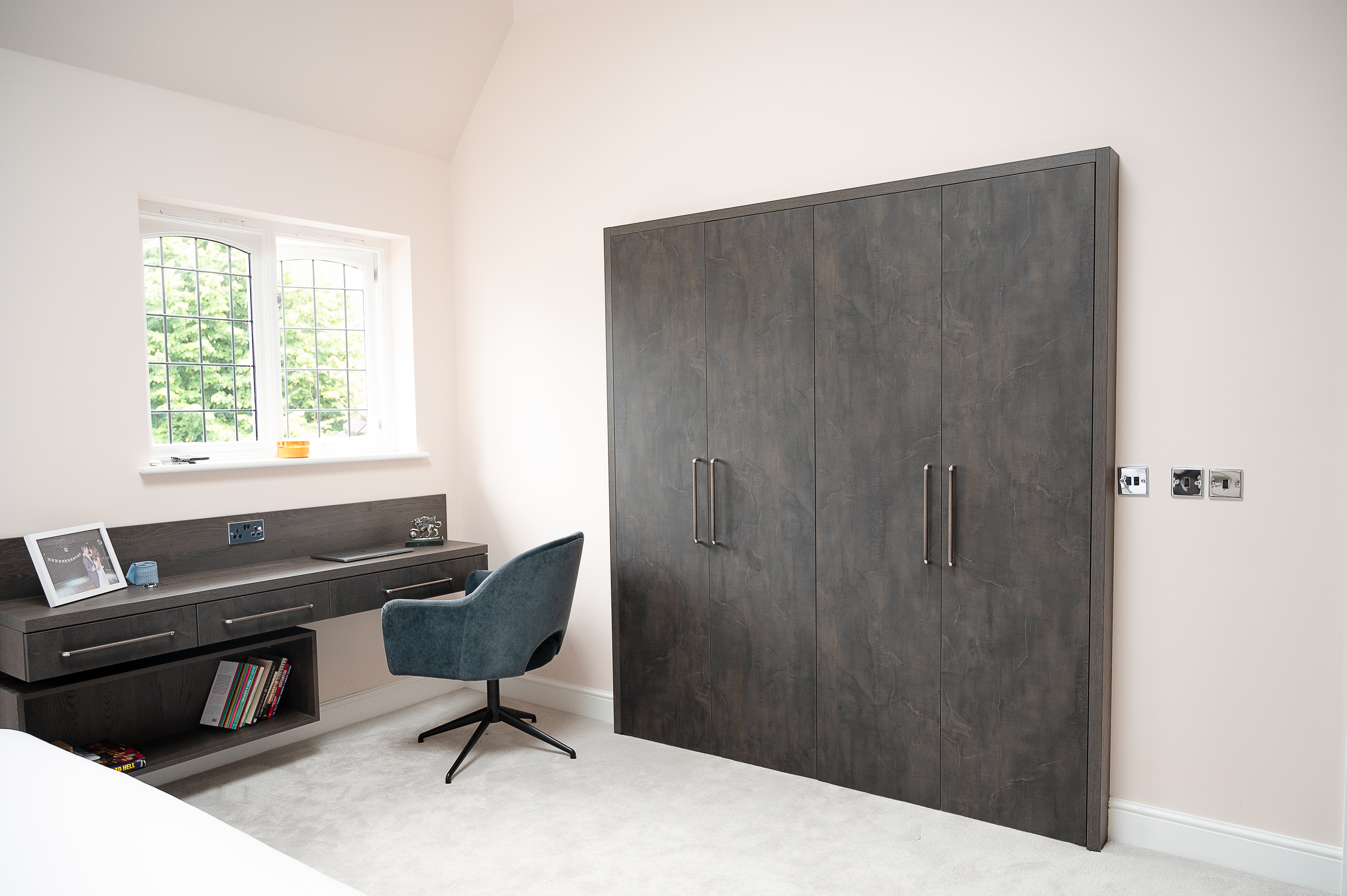 This colour scheme is carried through to the bedroom, where the wall art and some of the furniture has a similar dark blue-grey. The wardrobe doors have a bi-fold mechanism so that they are less obtrusive when open. They open up to a wardrobe with lighting strips to illuminate the range of storage solutions. The range of shelf heights were adapted to be the most convenient for the specific needs of this renovation.