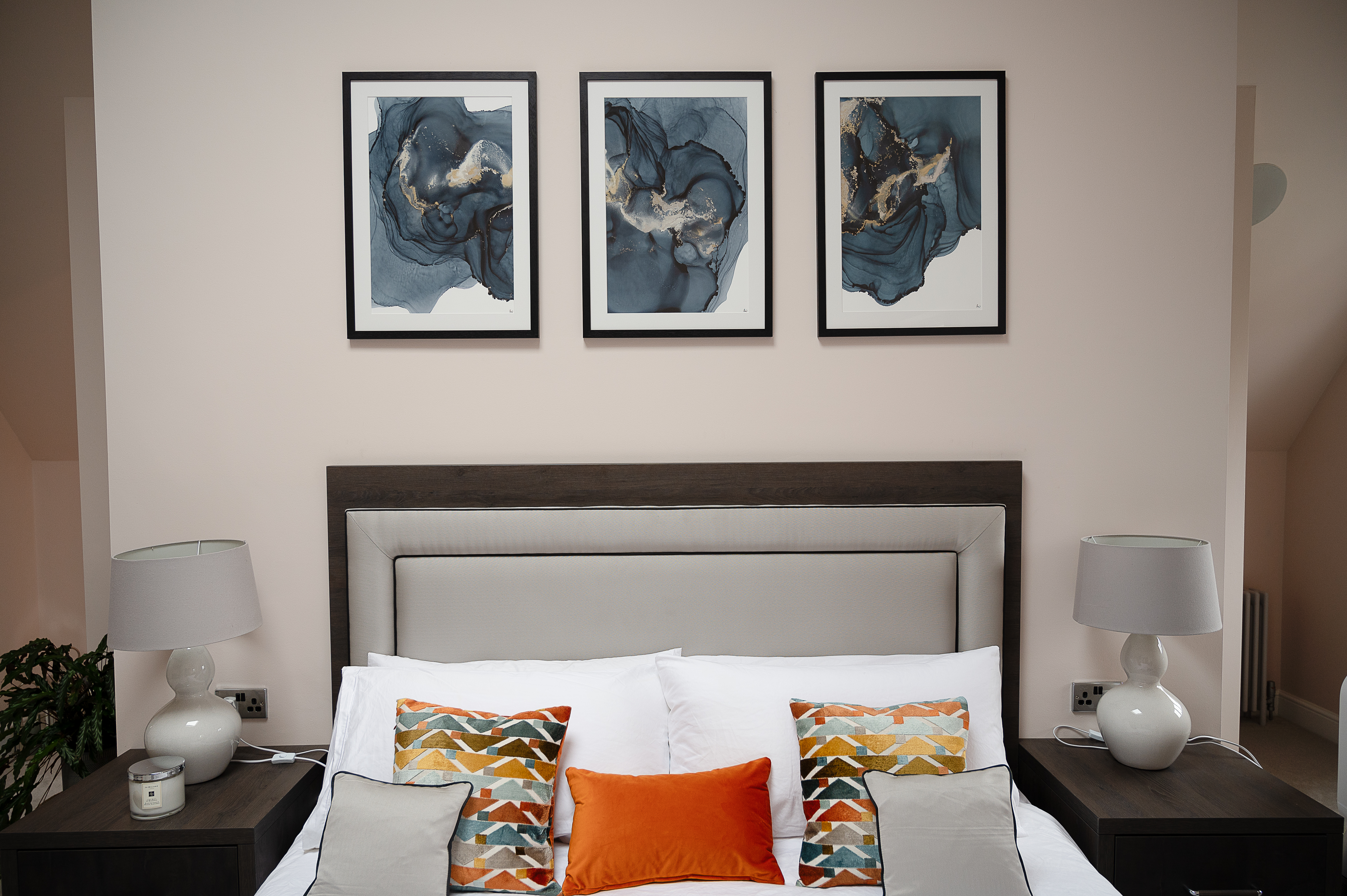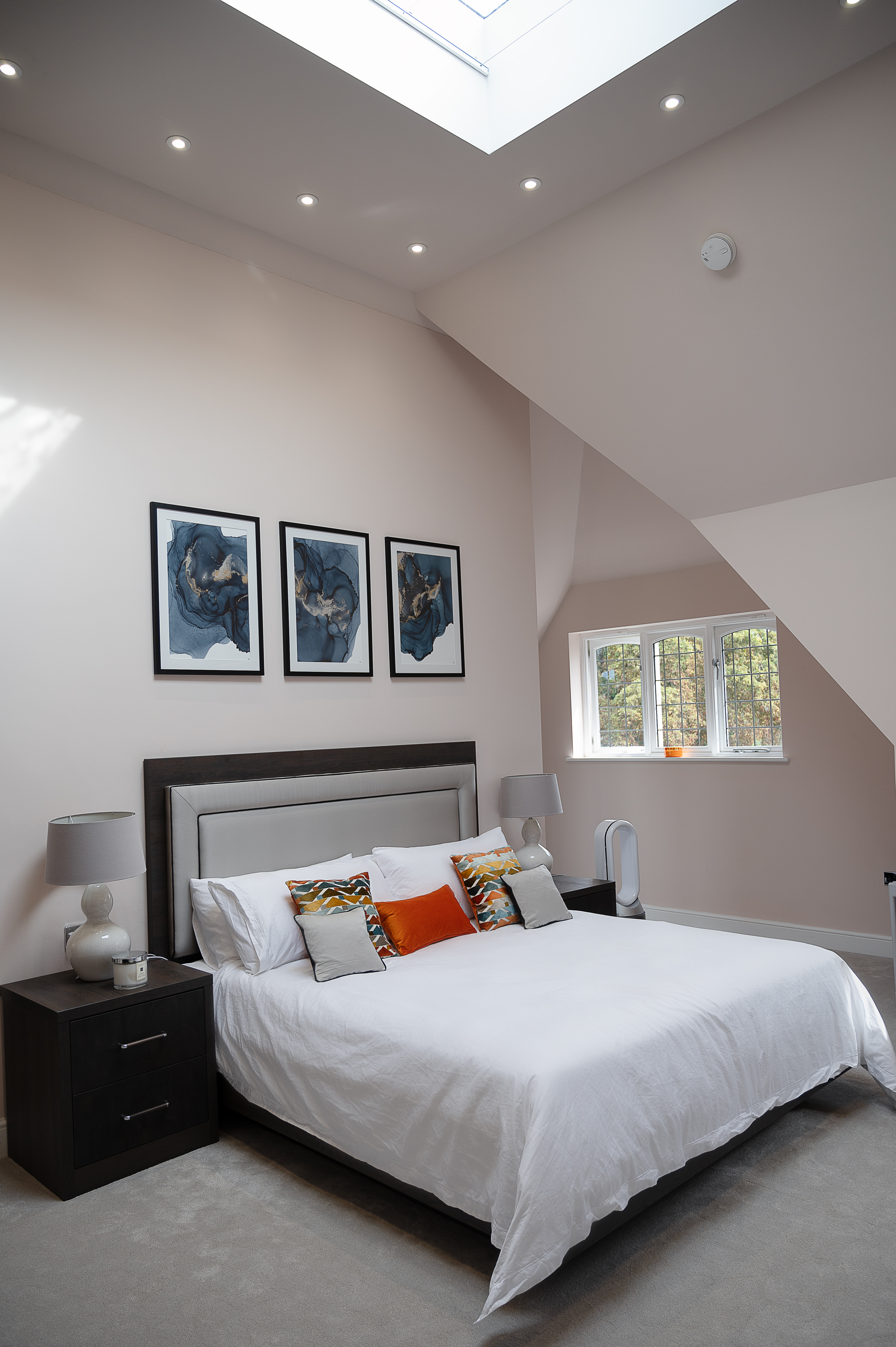 Our designer Debbie loved working with the client on this new loft room project. Together they transformed this space into the bedroom of dreams. In addition to the bedroom there is the walk in dressing area and a fabulous en suite. The whole room is bright, light and modern with finishing touches such as the vibrant cushions and the hand painted bespoke wall art tying everything together.