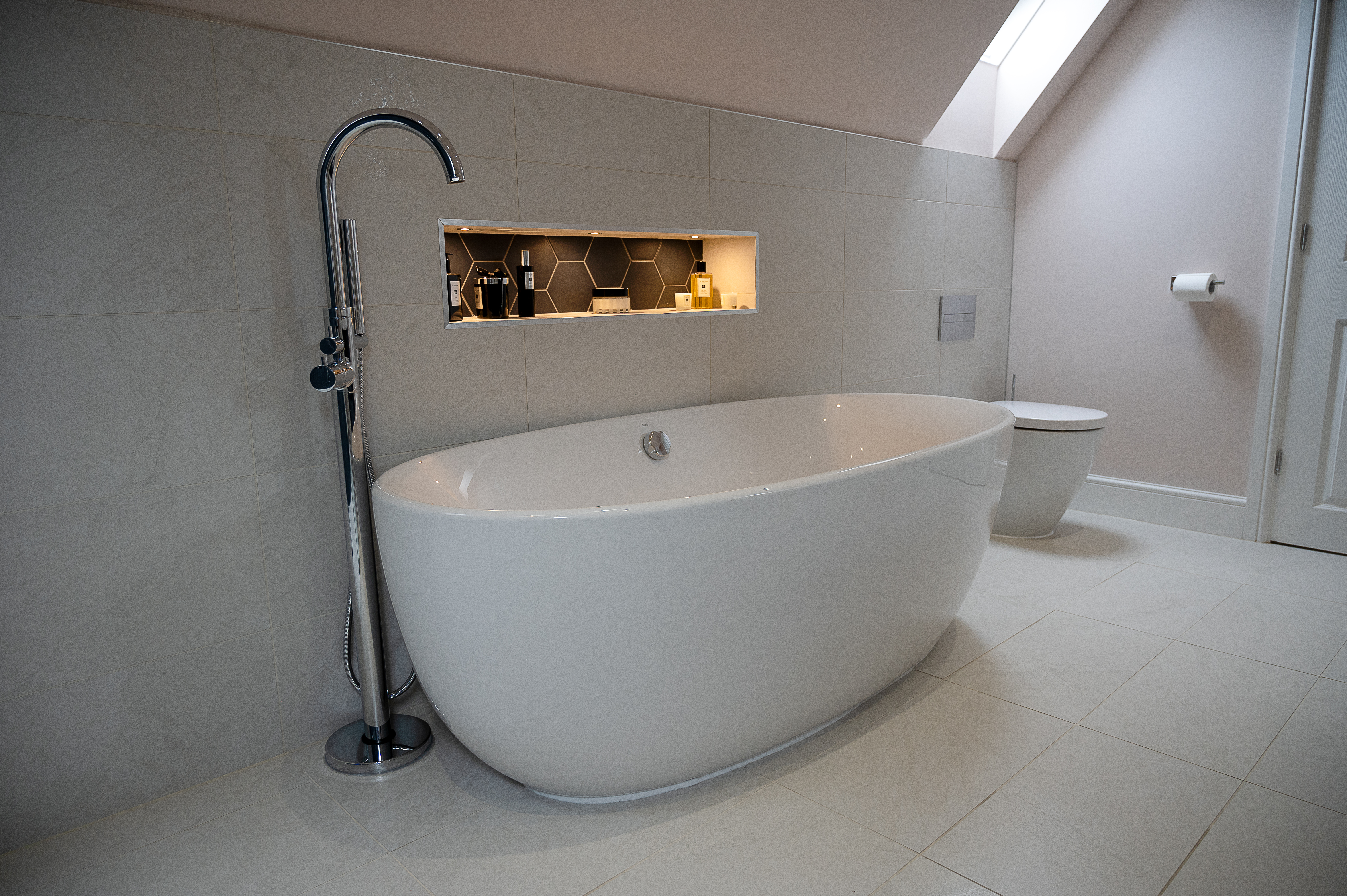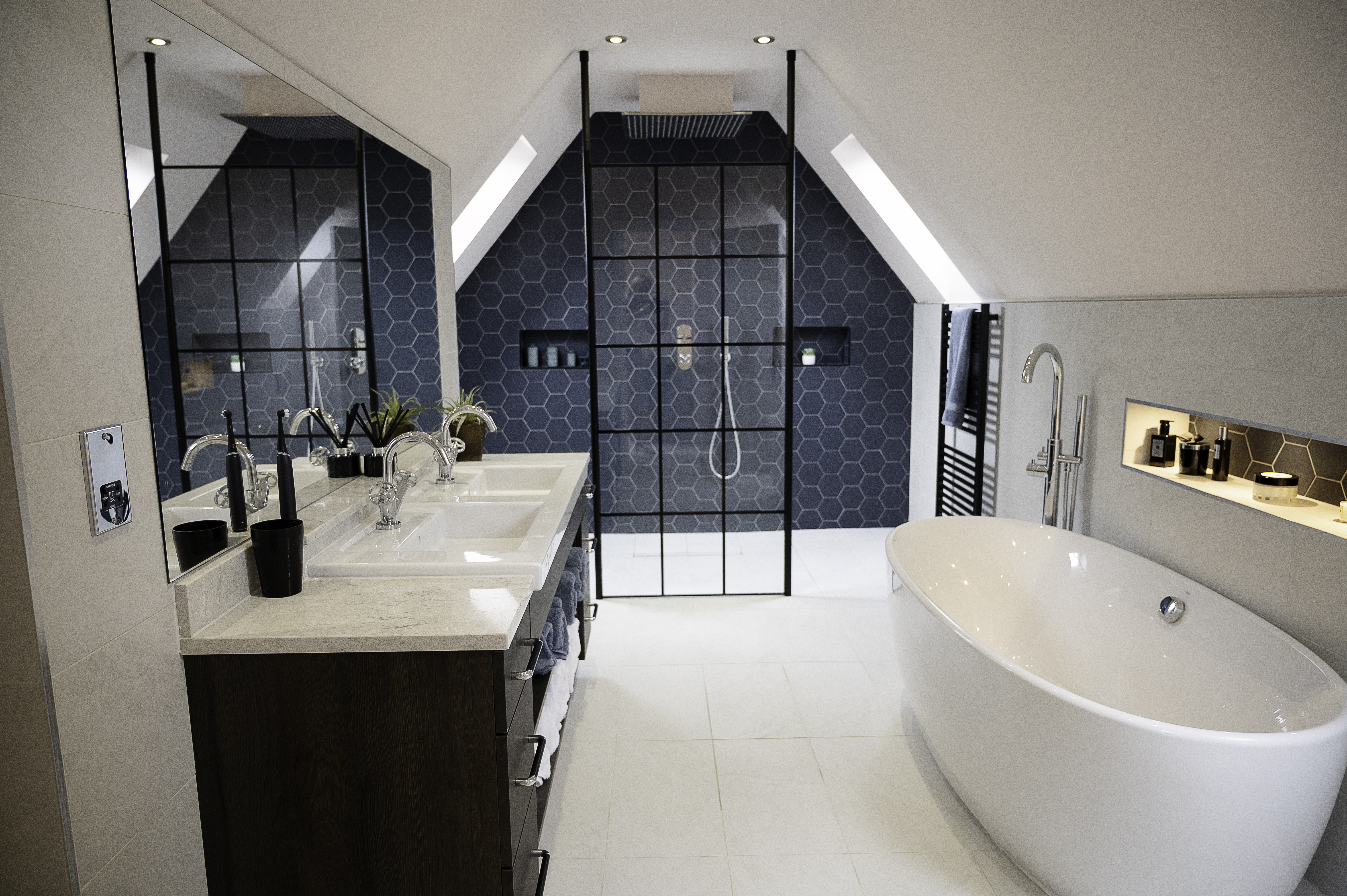 The white tiles on the floor and walls of the ensuite create a modern and clean look. The walk-in shower has a bold blue hexagon tiled wall, and carefully placed niches to create space to keep necessary shower clutter out of the way. The Roca Freestanding oval bathtub is accompanied by a Hudson Reed standing bath tap. There is also a niche built into the wall above the bathtub with the same blue tiles as in the shower.