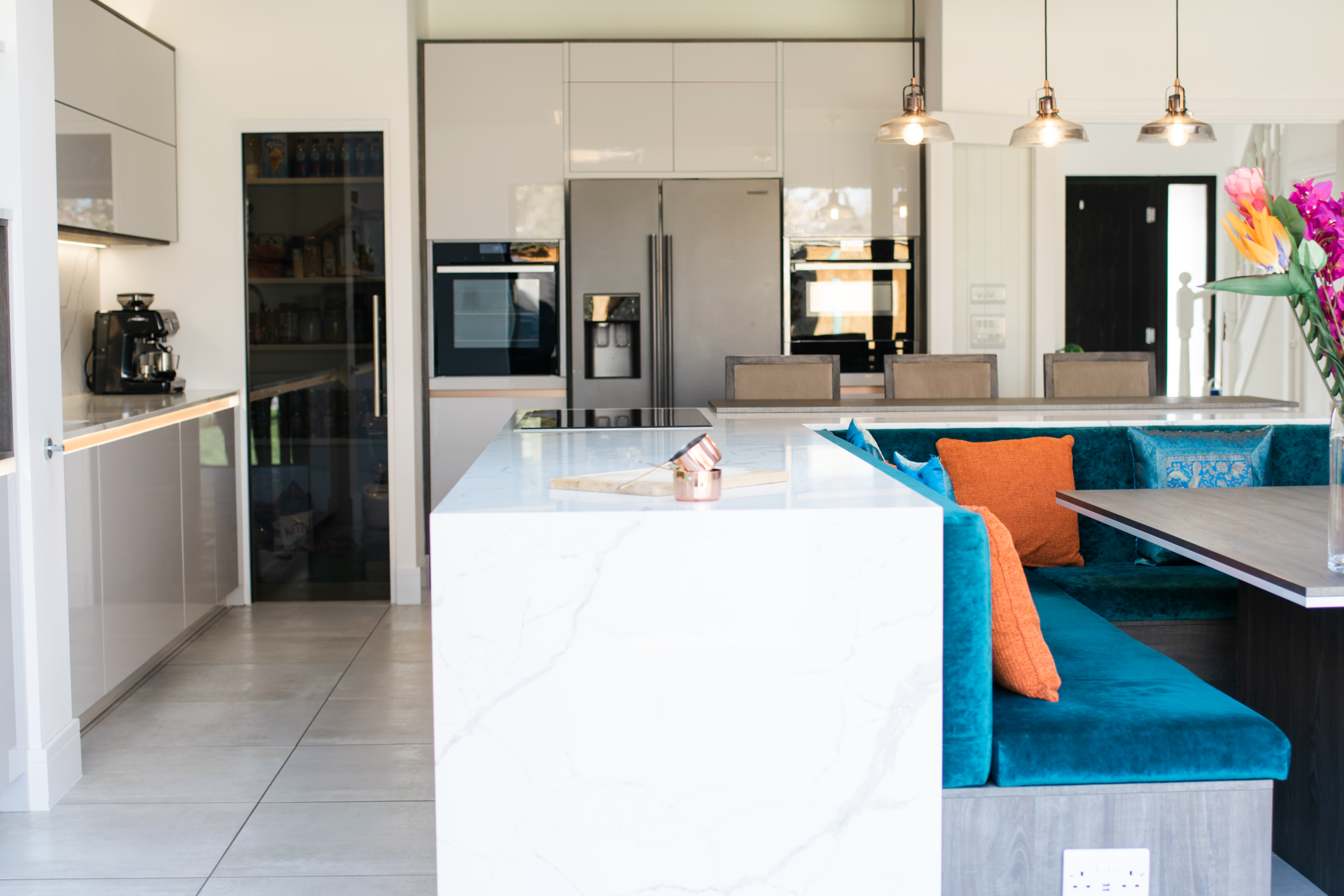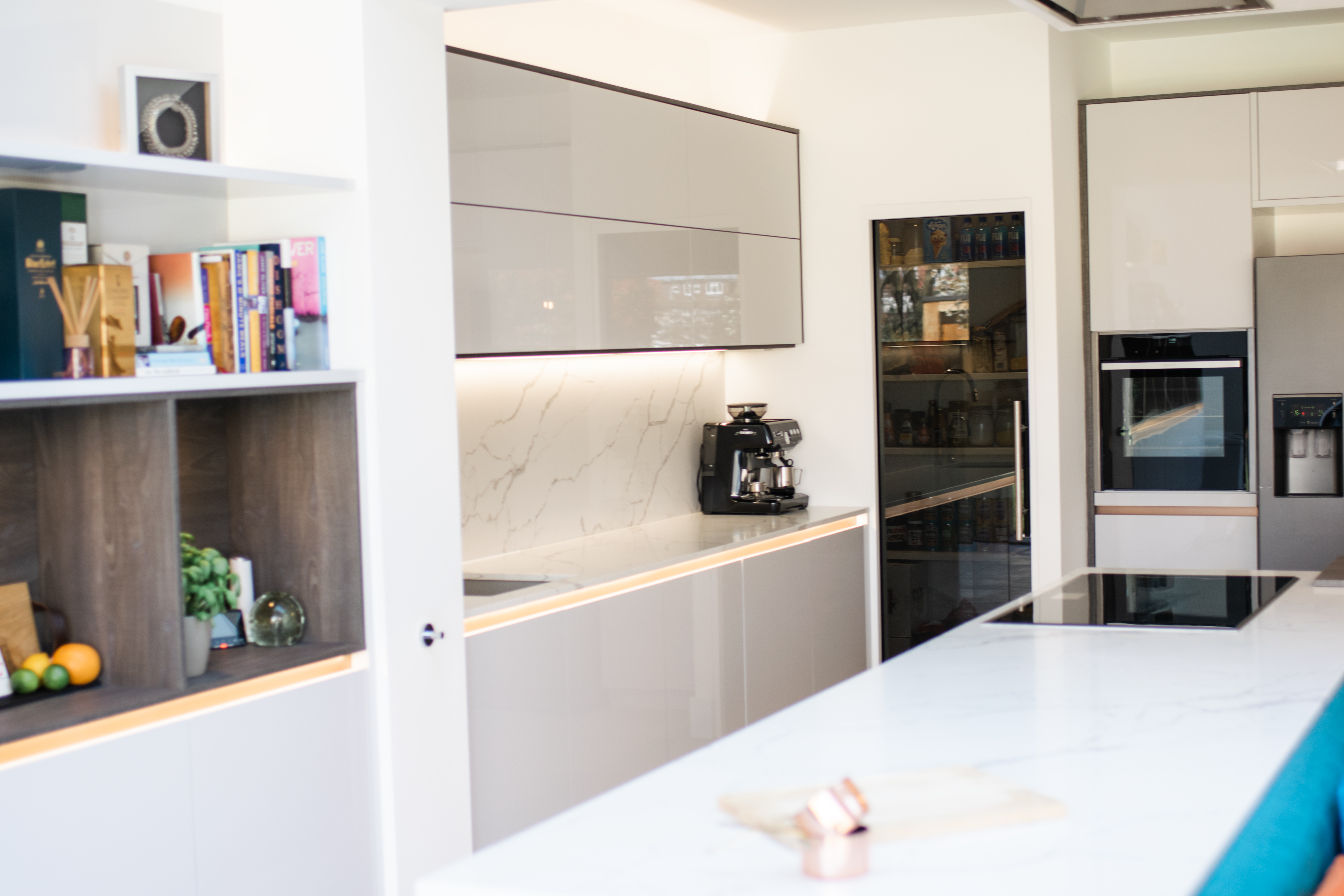 Anscombs designed the perfect layout introducing a leather feature Island with three very large drawer units to keep cooking utensils, pans and equipment organised. A custom built in pantry was created with a glass sliding door to keep all their food produce in a dedicated space with floor to ceiling shelving.