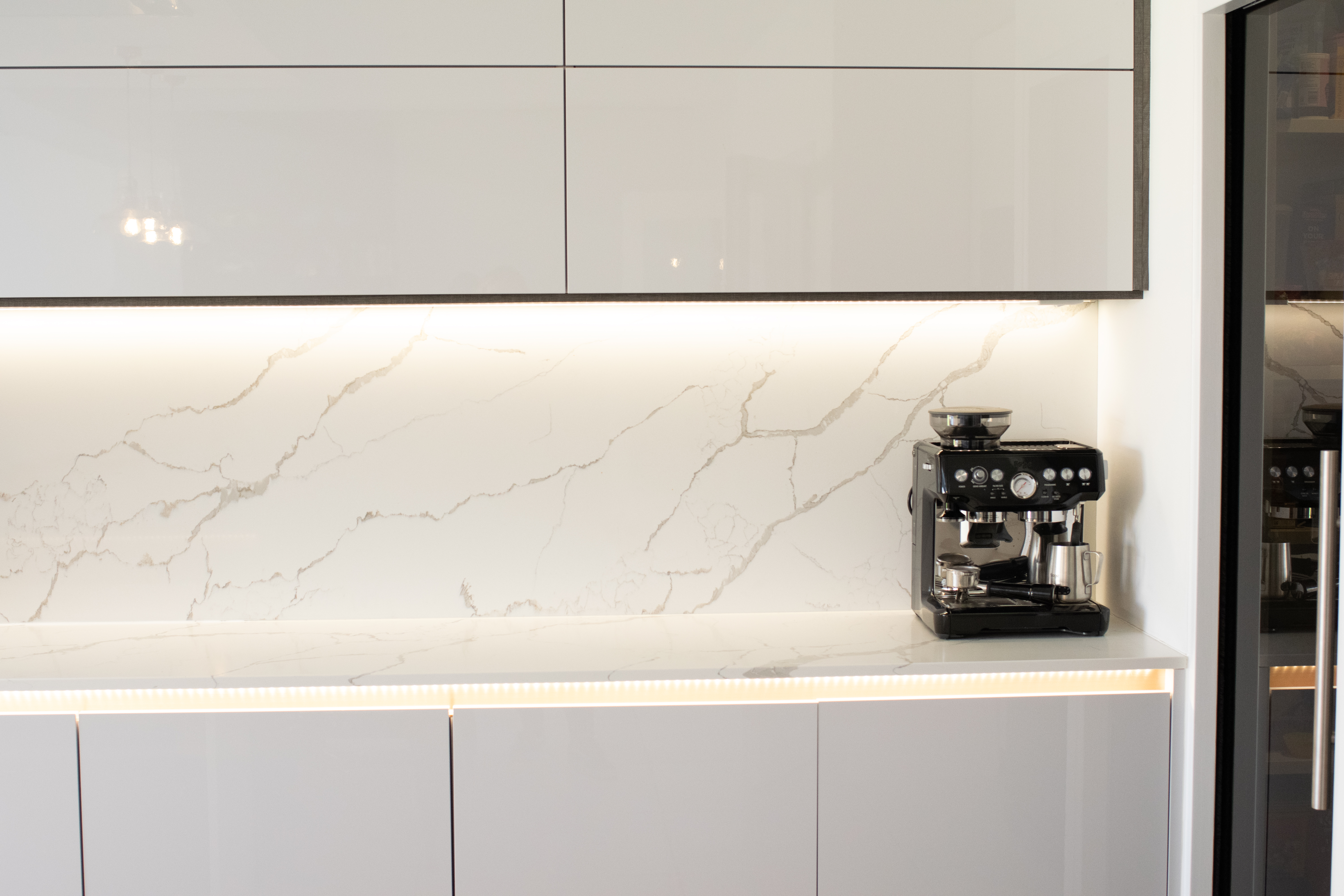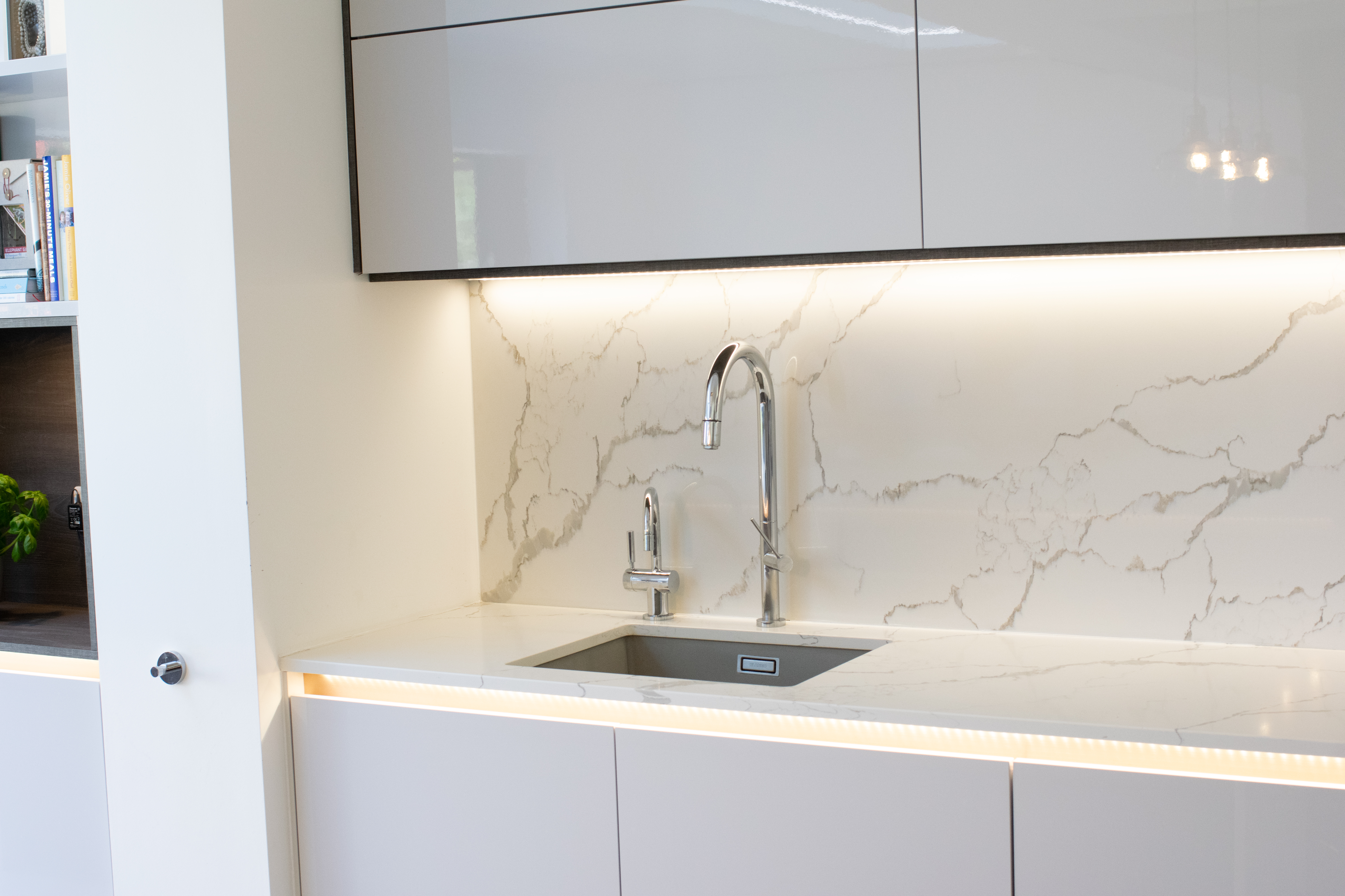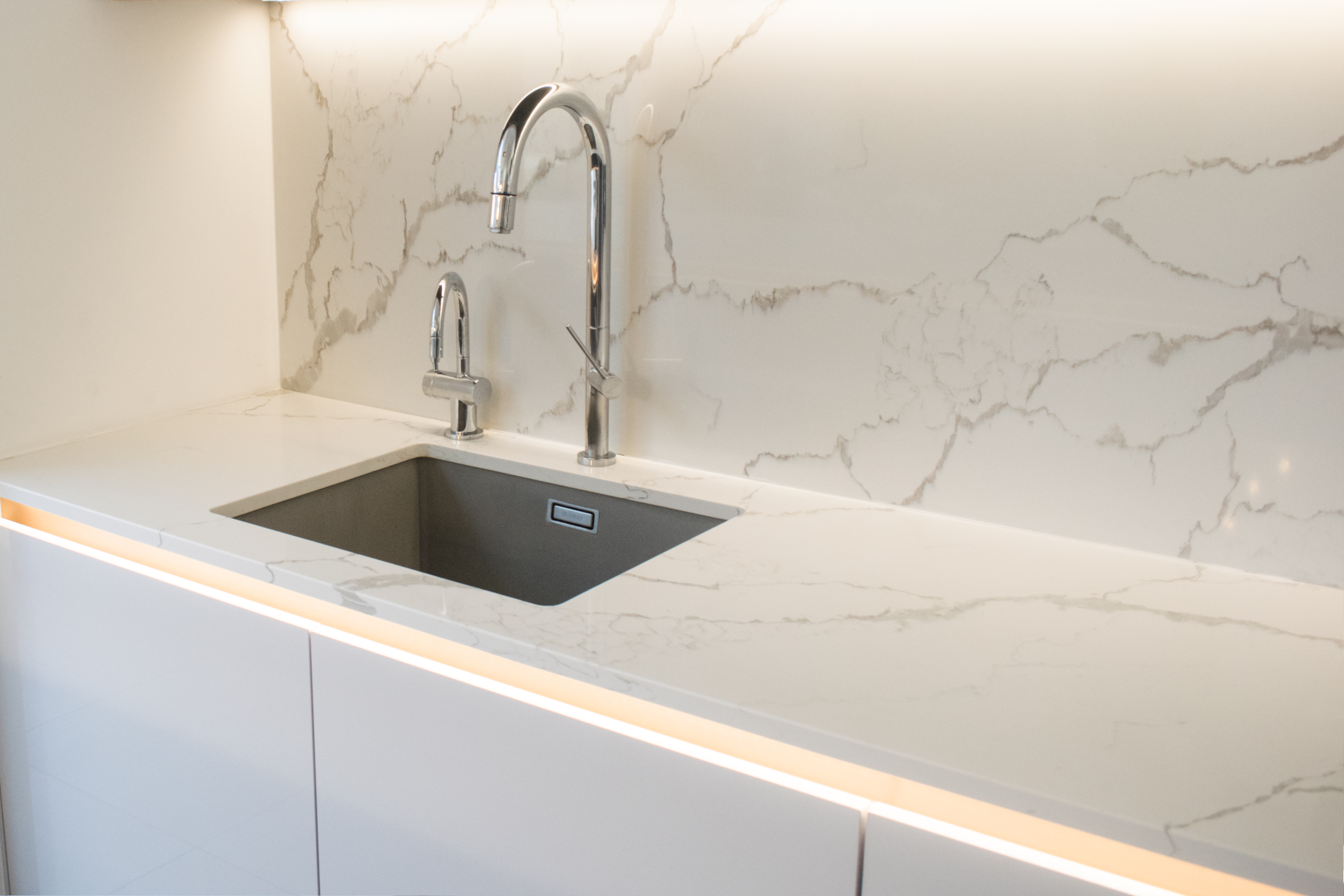 The superb choice of callacutta quartz work surfaces and wall cladding was a stunning finishing touch and as quartz enables easy cleaning and no ongoing maintenance this work surface is exceptionally heardwearing and well worth the cost.