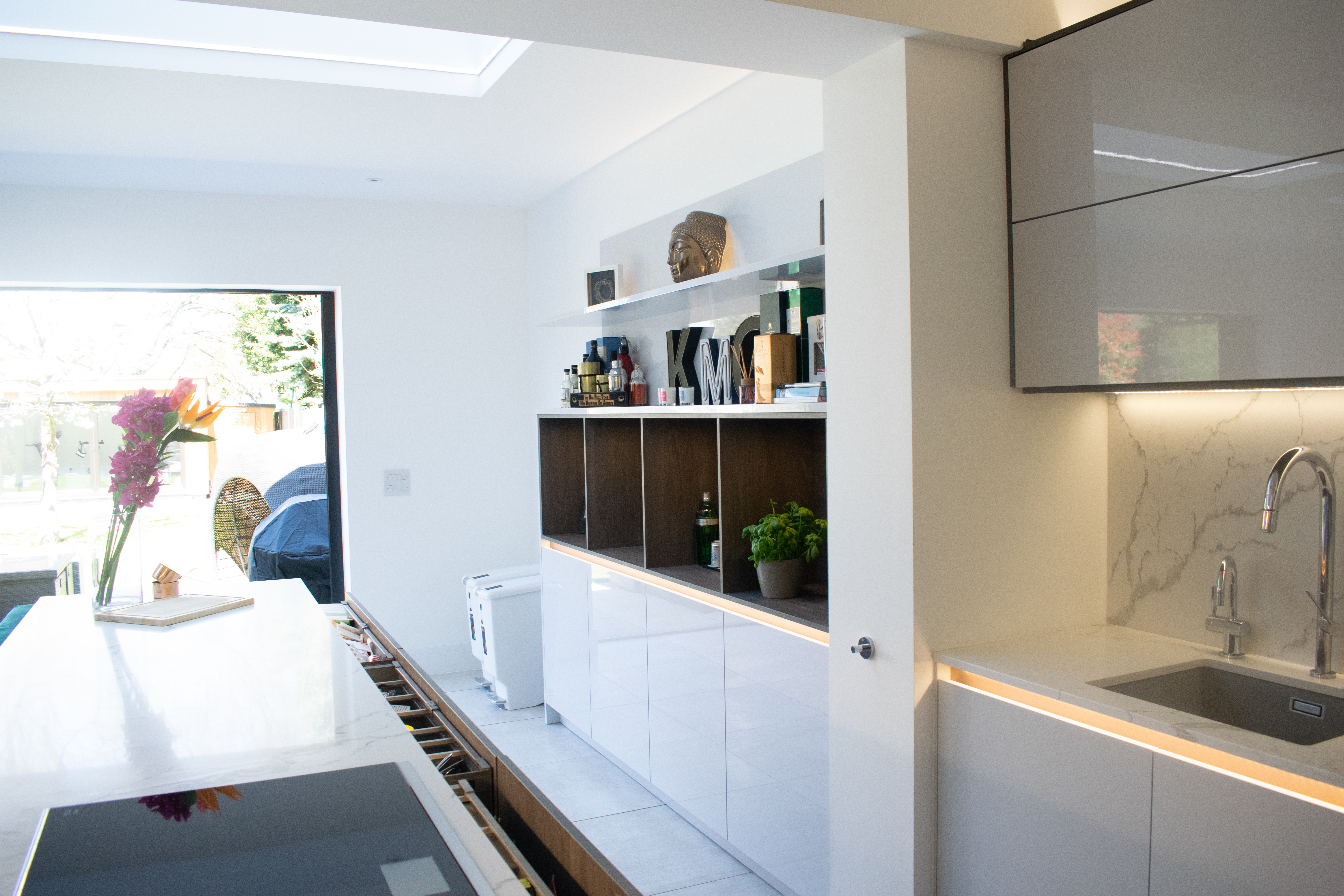 The contemporary open plan living style kitchen in light grey mirror gloss, copper handleless rails contrasting with a darker wood grain are in keeping with the other renovations in their Gidea Park home. Quality appliances were important to our clients so they opted for Neff appliances for their induction Hob, ceiling extractor ,dishwasher, main slide and hide single oven, compact oven microwave and warming drawer.